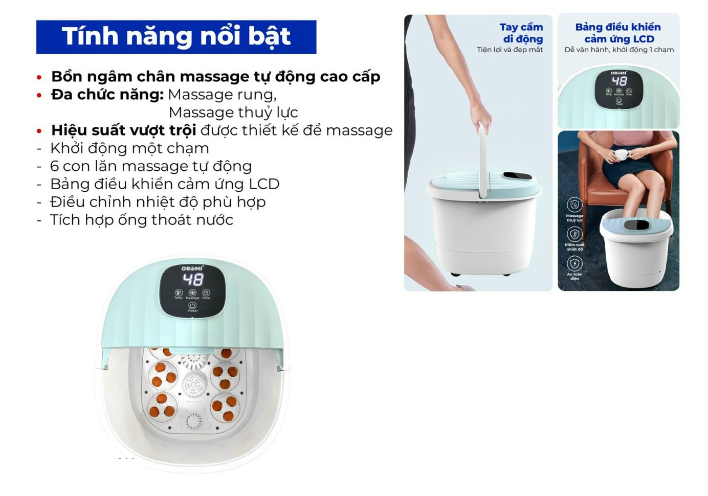 Bồn ngâm chân massage OROMI có chế độ tự động cao cấp bảo vệ đôi chân gấp bốn lần. Đa chức năng với hiệu suất vượt trội được thiết kế để massage - khởi động một chạm - 6 bánh xe mát xa - Bảng điều khiển cảm ứng LCD - tách điện-thủy lực - kiểm soát nhiệt độ - Bảo vệ an toàn
