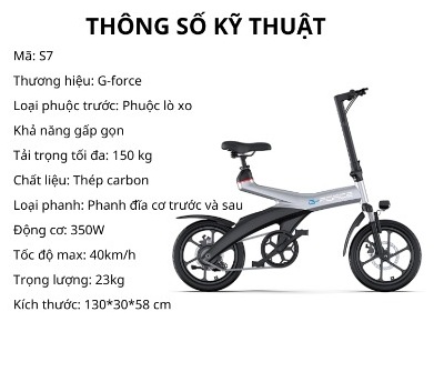 Xe đạp điện trợ lực G-Force S7 với thiết kế gấp gọn hiện đại, động cơ 350W mạnh mẽ và tốc độ tối đa 40 km/h, mang lại sự linh hoạt và hiệu quả cho mọi hành trình. Khung xe thép carbon bền bỉ, tải trọng tối đa 150 kg, cùng hệ thống phanh đĩa cơ an toàn và phuộc lò xo êm ái, S7 là lựa chọn lý tưởng cho những ai yêu thích sự tiện lợi và phong cách trong cuộc sống đô thị.