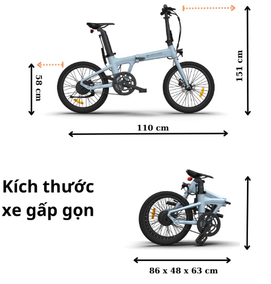 Xe đạp điện ADO A20 Air có thiết kế hiện đại, trẻ trung với 3 phiên bản màu sắc trắng ngà, xanh Pastel và xám. Xe có kích thước rất nhỏ gọn, chỉ 151 x 58 x 110cm, có thể gấp gọn xuống còn 86 x 48 x 63 cm. Trọng lượng của xe chỉ 17.5 kg, thao tác gấp gọn, tiết kiệm không gian cất giữ, mở rộng khá dễ dàng trong 10s chỉ với 3 bước. Phần tay lái ebike và yên xe có thể tùy chỉnh độ cao linh hoạt tùy theo mục đích sử dụng và nhu cầu của người lái. Với kích thước của xe thì đối tượng phù hợp để đi có chiều cao từ 155 – 200cm, chịu được tải trọng lên đến 100kg.