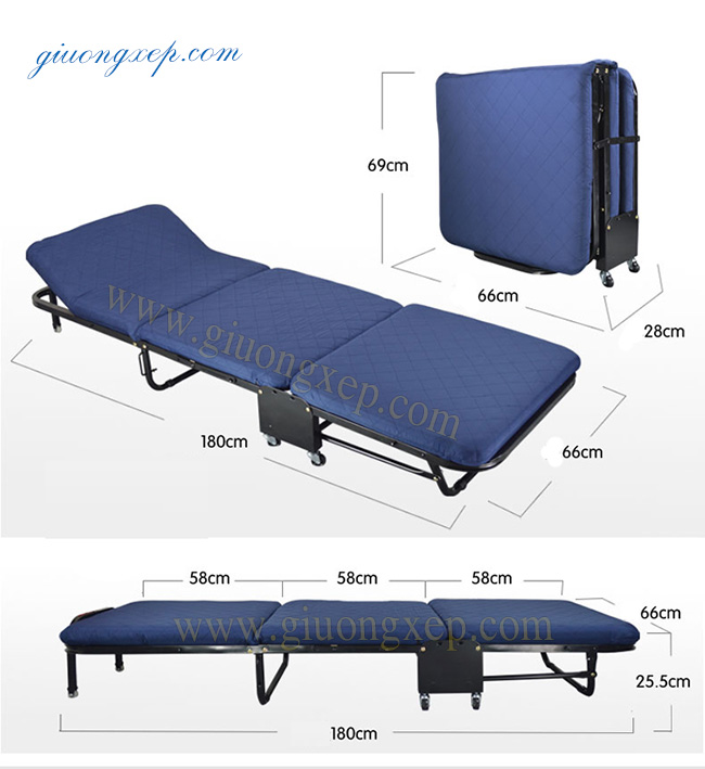 Giường xếp di động nâng đầu GB65 gấp 3 được sản xuất theo công nghệ Hàn Quốc, có phần khung làm bằng thép sơn tĩnh điện, nối với nhau bằng bản lề nên có thể gấp gọn.