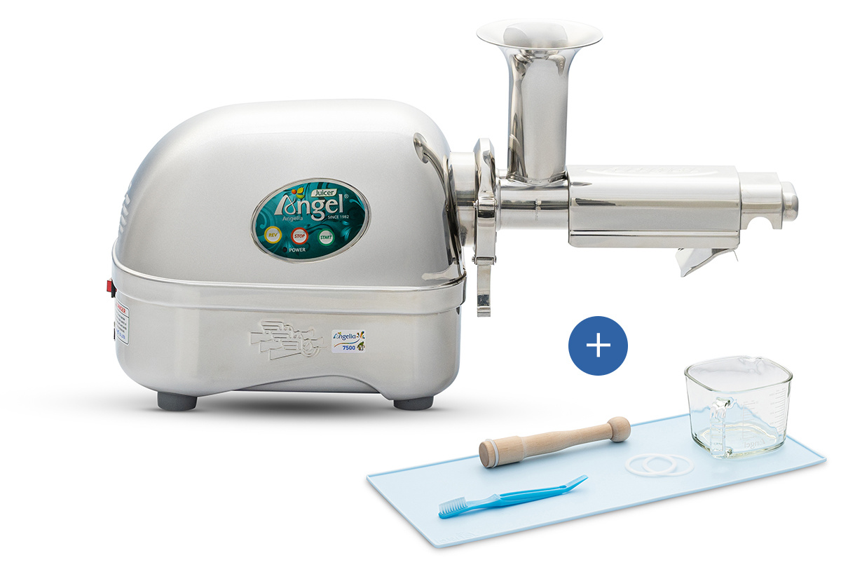 Máy Ép Chậm Angel 7500: Là phiên bản nâng cấp hơn so với Angel 5500. Nếu như ở phiên bản 5500, Hãng sản xuất trang bị hệ thống đảo chiều dạng thủ công cho sản phẩm (Người dùng cần phải bấm giữ nút bằng tay giúp bánh ép con sâu đảo ngược chiều hoạt động để tránh bị tắc nghẽn). Thì với phiên bản 7500, hãng sản xuất đã nâng cấp cảm biến bên trong máy giúp hệ thống đảo chiều có thể tự động nhận biết khi máy bị tắc nghẽn mà không cần sự can thiệp của con người.