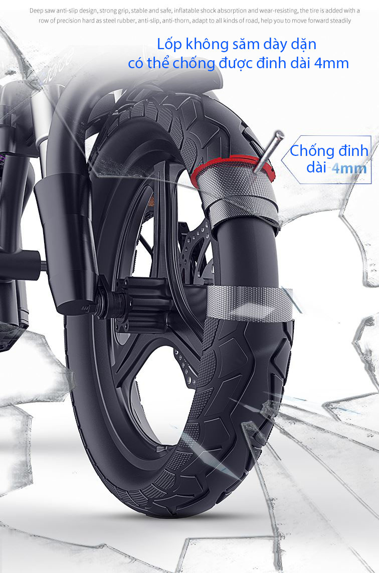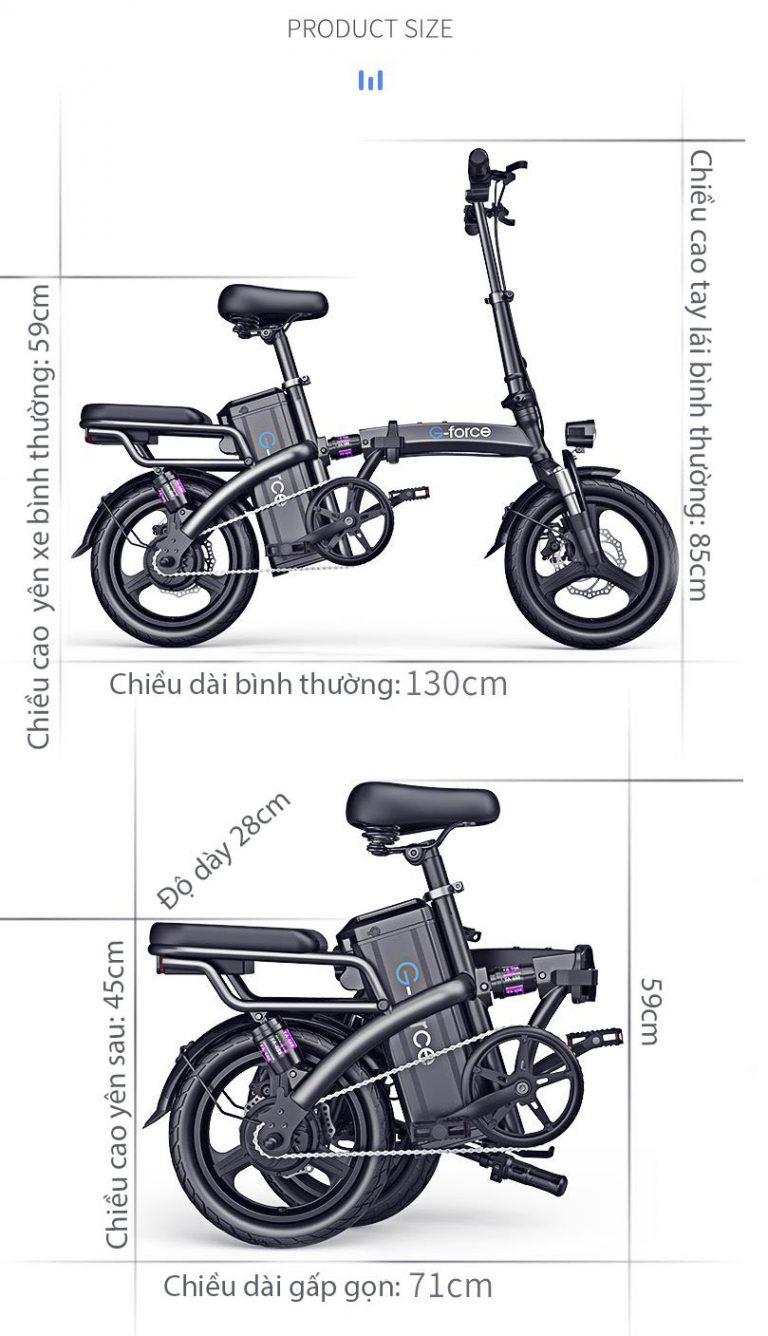 Thiết kế gấp đôi xe nhờ khóa khớp ở thân xe giúp đạt được kích thước cực kì nhỏ gọn, giúp bạn có thể hoàn toàn cất gọn vào cốp xe ô tô, mang vào thang máy các tòa chung cư hoặc dể gọn trong nhà mà không lo chiếm diện tích.